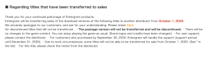 In a move that will undoubtedly affect fans of their niche offerings, Entergram is also transferring the sales of 50 other digital titles to new distributors.