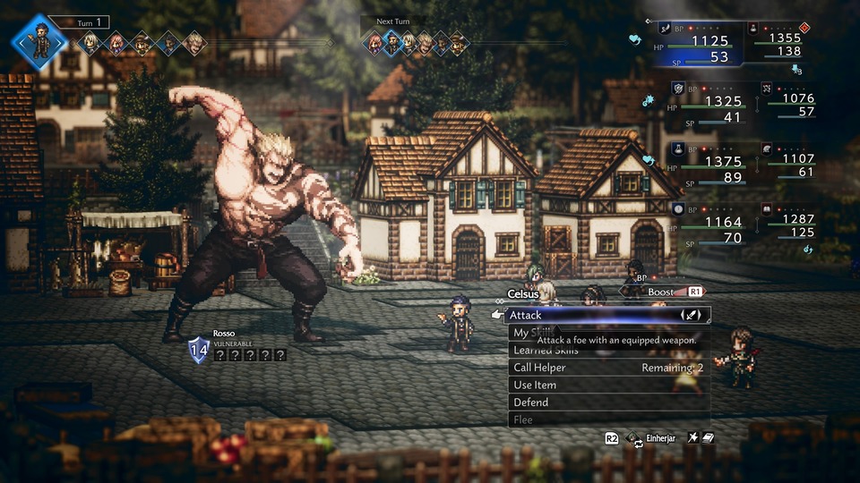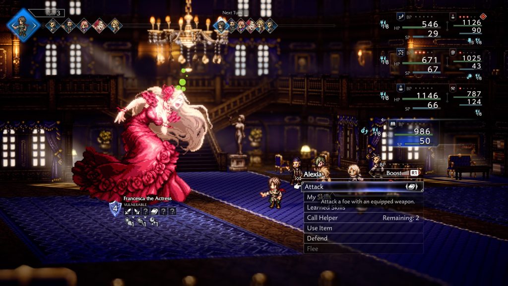 The combat mechanics haven’t changed significantly from the predecessors, aside from the UI and pacing speed. We can still use Boost and Defend (similar to the Bravely Default series). However, I rarely used Defend in Octopath Traveler 0 because characters regenerate 1 AP in the following turn as long as they don’t use Boost or attack. We have a maximum of 5 AP. Using a Max Boost amplifies a skill up to Level 3, but it does not increase the hit count for skills with a fixed number of hits.