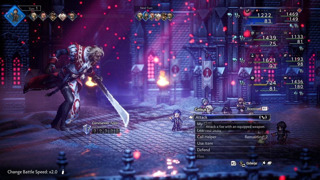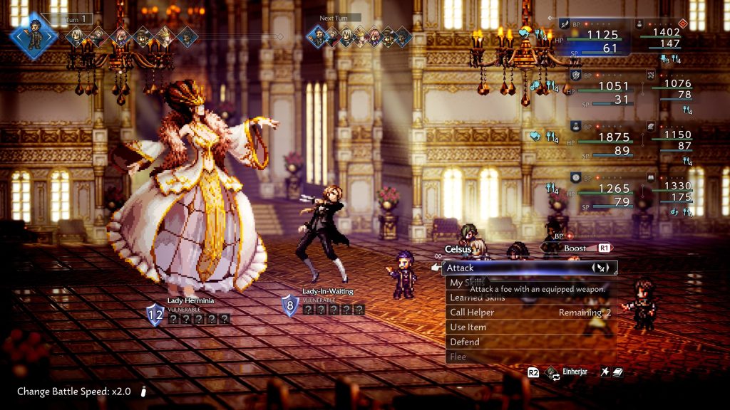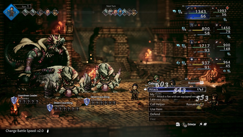 Shield points are reduced by hitting weaknesses. Once broken, enemies eventually recover their shields (sometimes increasing the total count). This is where the Scholar job shines. The Scholar’s Analyze skill reveals HP and one weakness. If the main character is a Scholar, this triggers automatically at the start of a turn.
