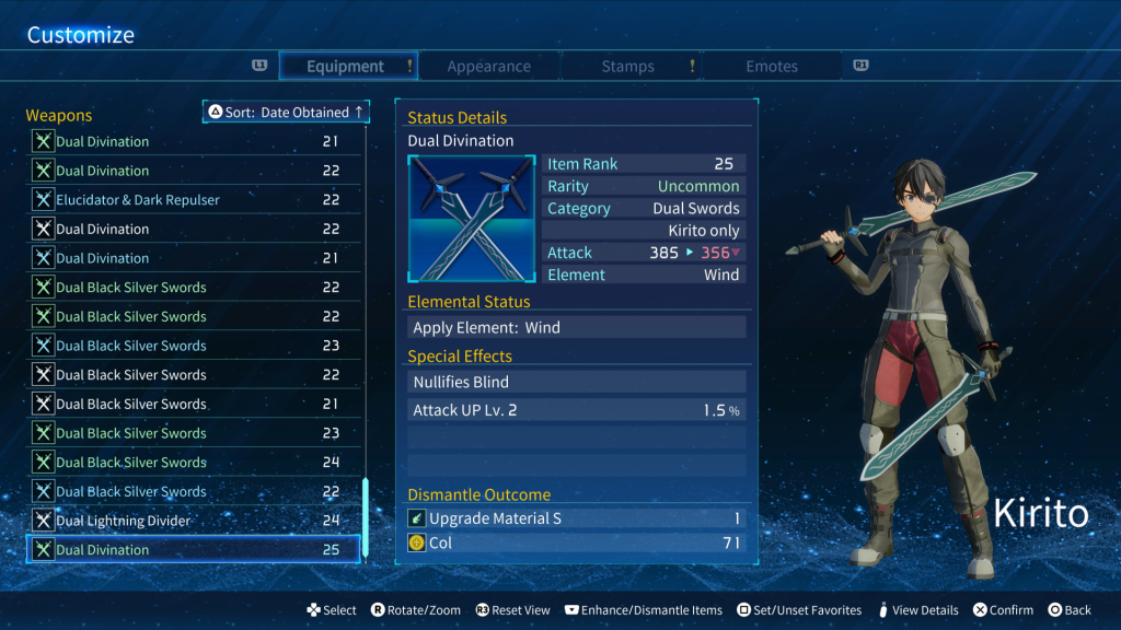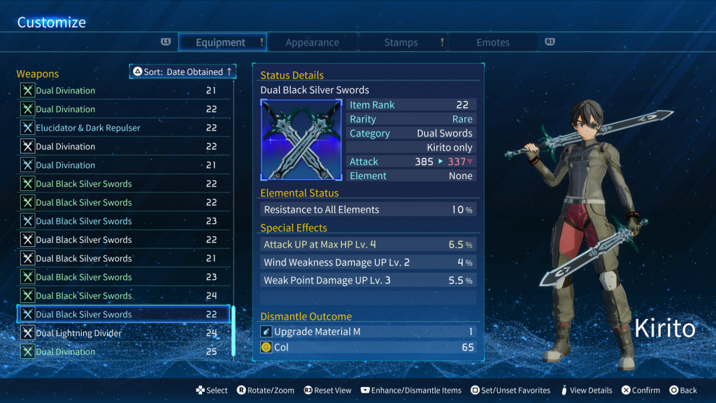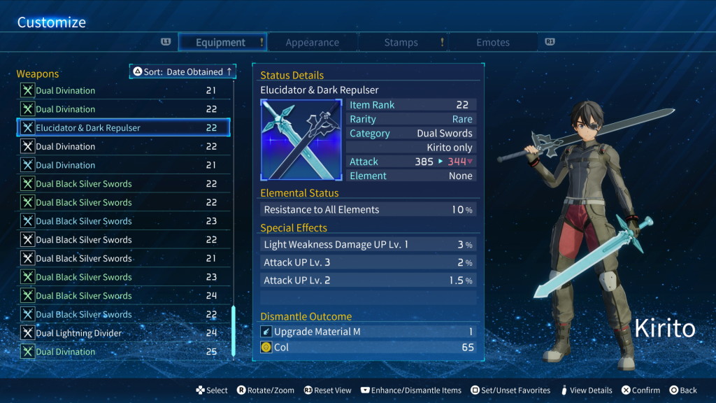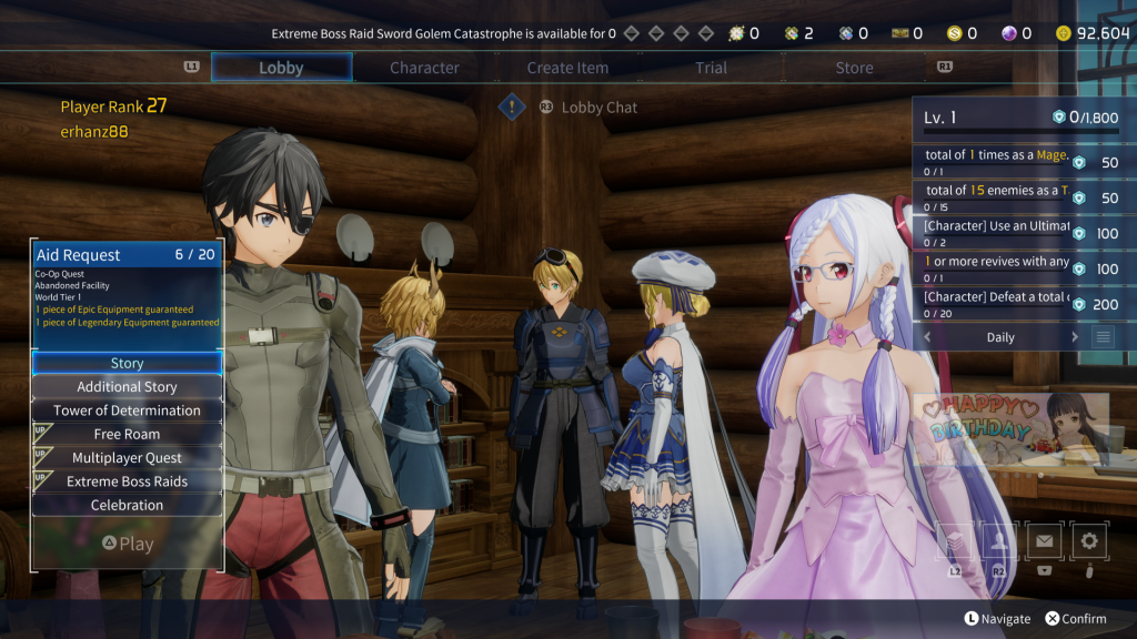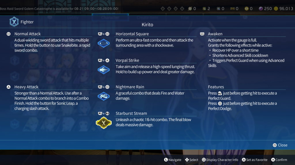 One thing that we need to mention is that when playing the Story Quests, your character doesn’t really have a “level”, unlike the previous SAO games, which are basically normal JRPGs where you can increase the Level of your characters, learn new skills, and arrange how you want to build your character, in SAO Fractured Daydream, your character will always starts from 0 in every chapter.
